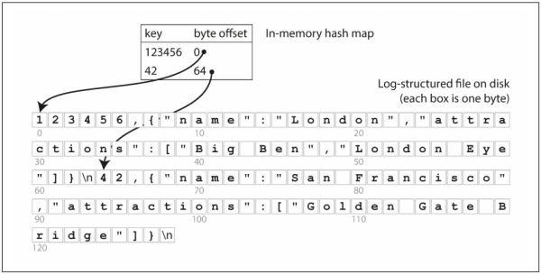 바이트 오프셋은 위의 그림과 같이 키를 통해 바로 값을 찾을 수 있습니다. 파일에 새로운 key-value 쌍이 추가될 때마다 해시 맵도 갱신해야 합니다.