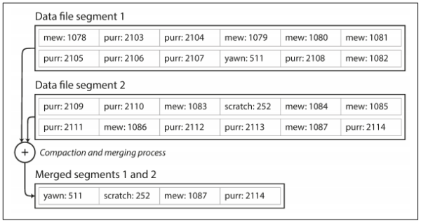 지금까지 설명한 것과 같이 계속 파일에 추가만 하는 경우 디스크 공간이 부족해집니다. 이러한 문제를 해결하는 방법으로 특정 크기의 세그먼트로 로그를 나누는 것입니다. 즉, 파일이 특정 크기에 도달하면 세그먼트 파일을 닫고 새로운 세그먼트 파일에 추가를 하는 것입니다. 이러면 각각의 파일에 대해 컴팩션(compaction)을 수행할 수 있습니다. 컴팩션은 각 로그의 중복된 키 값을 버리고 각 키의 최신 값만 유지하는 것을 의미합니다. 이러한 세그먼트 파일은 변경할 수 없기 때문에 컴팩션을 통한 병합된 세그먼트는 새로운 파일로 만듭니다. 컴팩션의 경우 백그라운드 스레드에서 수행이 되며, 컴팩션을 수행하는 동안에도 사용자의 읽기나 쓰기 요청도 정상적으로 처리할 수 있습니다. 병합이 완료되면 새로 병합한 세그먼트를 사용하도록 전환하고 전환 후에는 이전 세그먼트 파일을 삭제합니다. 다음 그림은 컴팩션과 병합을 수행하는 과정을 나타낸 그림입니다.