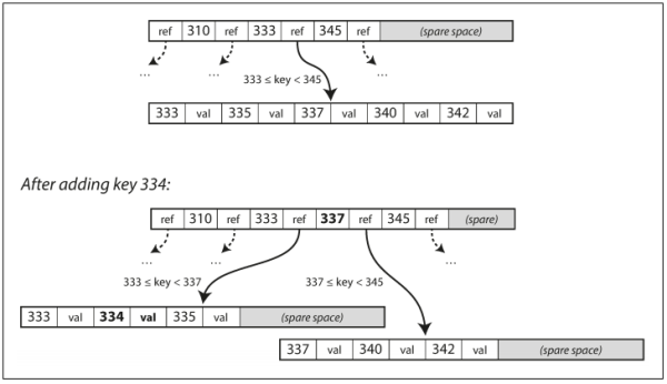 B 트리에 존재하는 키의 값을 update 하려면 리프 페이지까지 검색한 후에 페이지에 있는 값을 변경 후 디스크에 다시 씁니다. 새로운 키를 추가하려면 아래의 그림과 같이 새로운 키를 포함하는 범위의 페이지를 찾아 해당 페이지에 키와 값을 추가합니다. 만일 쓰려고 하는 페이지에 여유 공간이 없으면 페이지를 둘로 나누고 상위 페이지가 새로운 키 범위를 가진 하위 페이지들을 알 수 있게 갱신한 후 추가합니다.