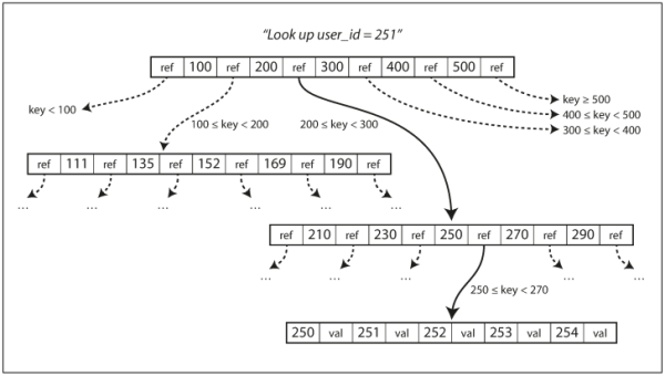 색인에서 원하는 키를 찾으려면 루트에서부터 시작합니다. 위의 그림은 user_id 251을 찾고 있기 때문에 200과 300 사이의 페이지의 참조를 따라갑니다. 그 다음 250과 270 사이에 참조를 따라가서 최종적으로 leaf 페이지에 도달하고 252의 값을 찾습니다.