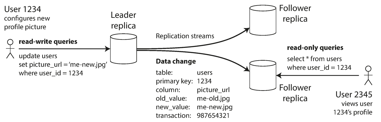 싱글 리더는 복제 서버들 중 하나가 리더가 되서 데이터의 복사본을 유지하는 것입니다. 클라이언트가 데이터베이스에 쓰기 요청을 하면 요청은 리더에게 보내지고 리더는 먼저 로컬에 새로운 데이터를 기록합니다. 리더는 로컬 저장소에 새로운 데이터를 쓸 때마다 데이터의 변경을 replication log나 change stream의 일부를 팔로워에게 전송하고 각각의 팔로워들은 리더가 처리한 것과 동일한 순서로 모든 쓰기를 적용해 복사본을 갱신합니다.