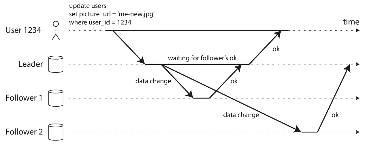 보통 리더 기반 복제의 경우 완전히 비동기식으로 구성합니다. 리더가 잘못돼서 복구할 수 없는 경우 데이터가 유실될 수 있습니다. 하지만 모든 팔로워가 잘못되더라도 리더는 쓰기 처리를 계속할 수 있습니다.